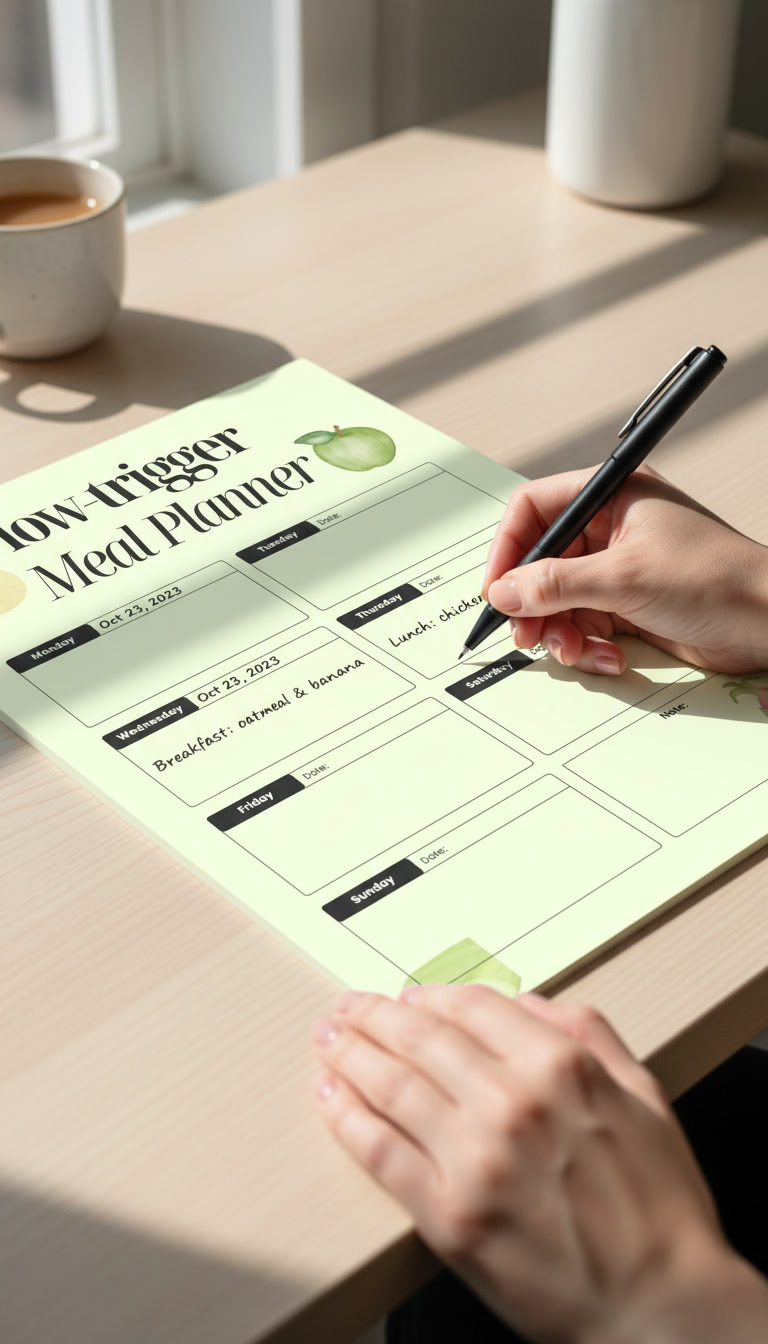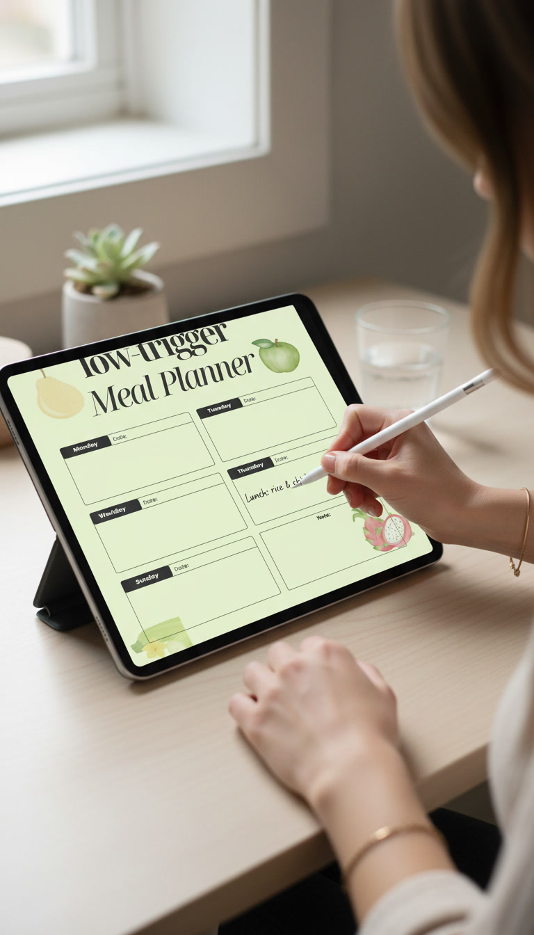 The Low-Trigger Weekly Meal Planner is a simple, printable tool made especially for people with digestive sensitivities, such as those with MCAS, IBS, or other diseases that cause flare-ups when certain foods are consumed. The goal is to help you break free from those stressful last-minute choices that usually result in you reaching for anything at hand—only to regret it later by bringing some peace and order to your eating schedule.